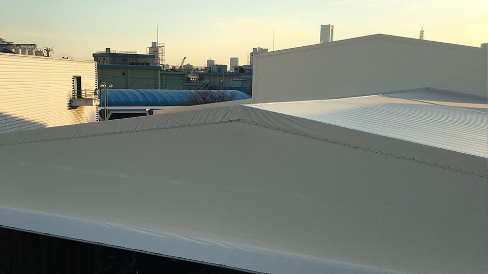 資材置き場が欲しいけど倉庫は高そうだし、工事期間も長そう。そんな時はテント倉庫。低価格、短納期、しかも丈夫。トラックターミナル等で荷捌き用の雨よけが欲しい。そんな時は荷捌きテント。上屋で雨にも濡れず、高さも自由設計。店舗等の軒先に雨よけ、日よけが欲しい。そんな時は軒先テント。ワイドも出幅も伸縮もカラーバリエーションもデザイン豊富でお客様のイメージカラーに合わせる事もできます。工場内の間仕切り、クリーンルーム等も弊社にお任せ。防音、遮光、ニーズに合わせて形も色々。現在では飛沫防止用にもテントが至る所で使われております。勿論、アクリル板の間仕切りやクリーンブースも多数施工行っております。