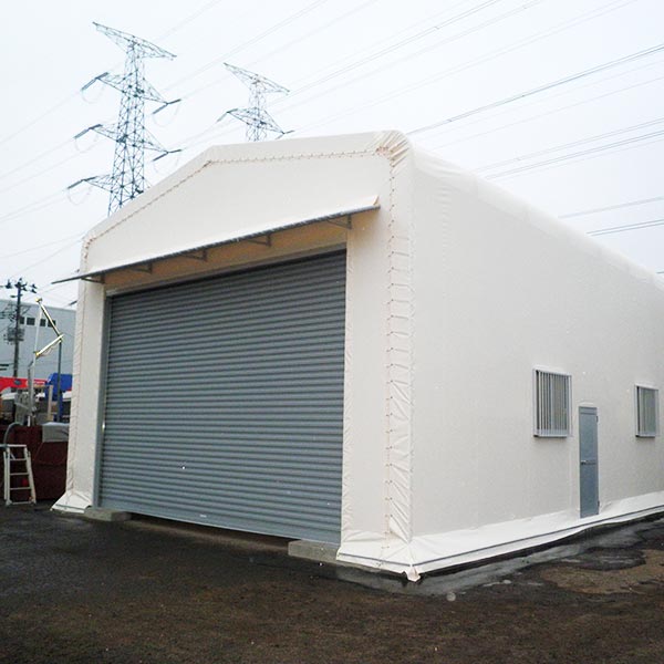 クレーンで出し入れする様な大きな資材は可動式テントがオススメです。ジャバラ式で伸縮する物や固定倉庫自体をレールの上を走らせて移動する事も可能です。